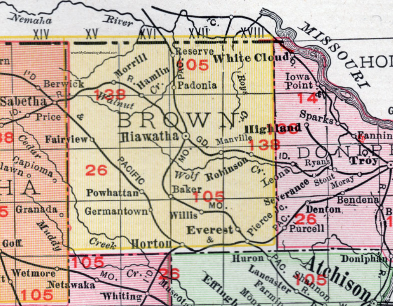 Mount Roy 1857 -1858 & 1871-1882, located east of Hiawatha, named after Roy and Katherine Cole. The Town is also referred to as Mount Roy.