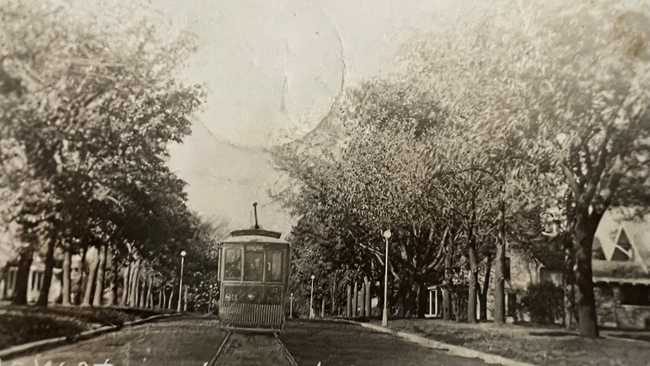Street Car and Tree Scene in Hiawatha. Postcard Gem is part of the Brown County Historical Society Collection.